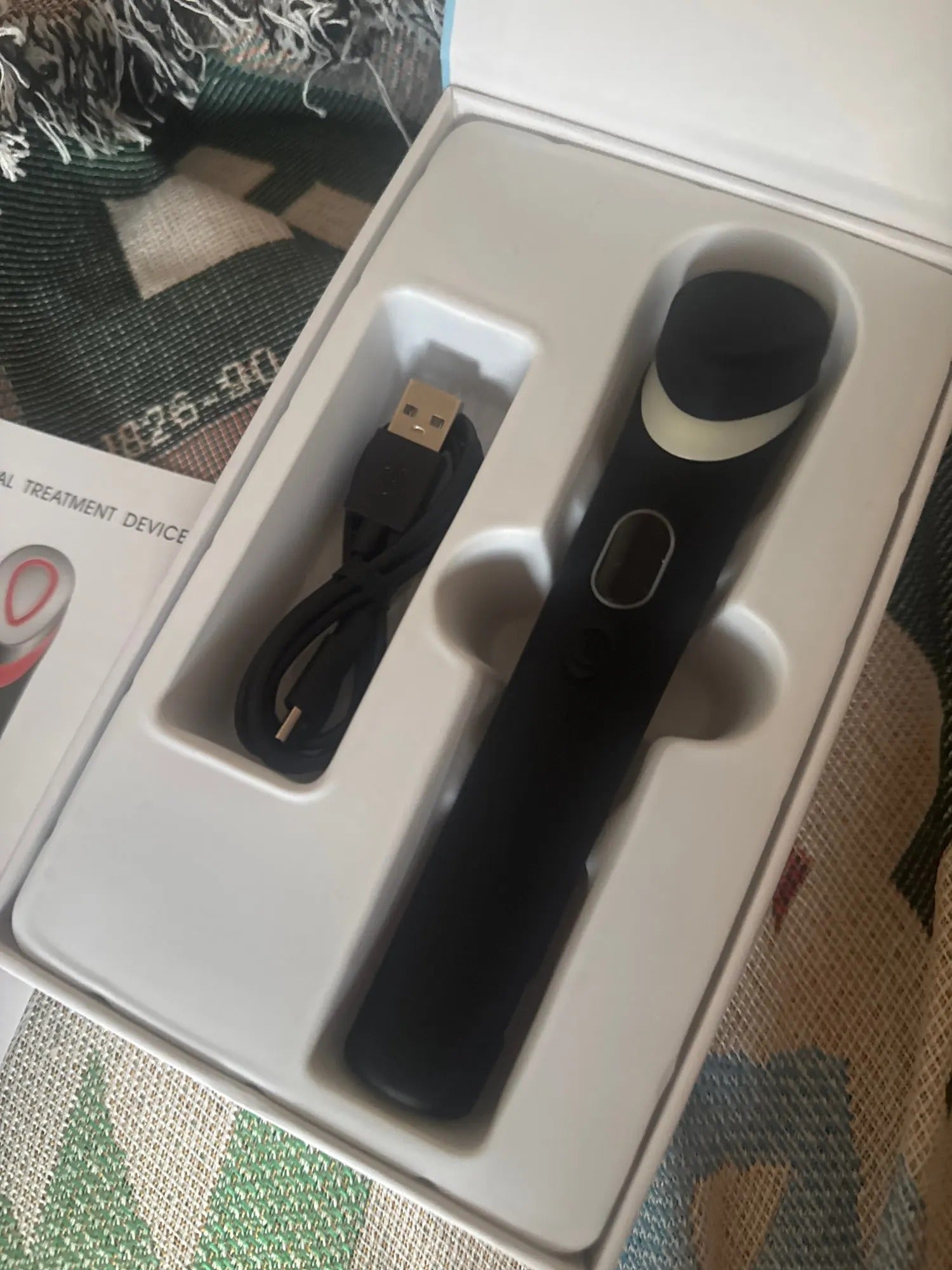 It stimulates collagen and facial muscles using LED light and EMS microcurrent.